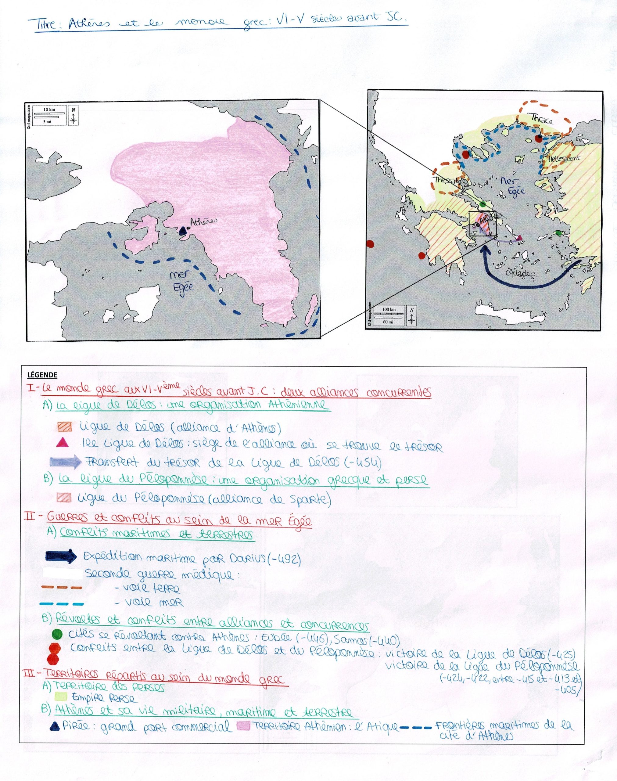 Vous avez réalisé une très belle carte. La légende est bien organisée on retrouve bien les trois grandes parties et les sous parties. Le titre reprend celui du sujet et répond clairement à la problématique. La légende est équilibrée et claire et elle suit la chronologie des événements .En revanche pour les victoires de la Ligue de Délos et du Péloponnèse il y a les mêmes figurés de la même couleur qui sont utilisés. Les lieux et les mers sont bien situés sur la carte et l’écriture est lisible et claire. Pour la carte tous les figurés de la légende y sont localisés mais il y aurait pu avoir davantage d’informations sur la carte d’Athènes. Le coloriage est soigné et précis la carte est facile à lire.