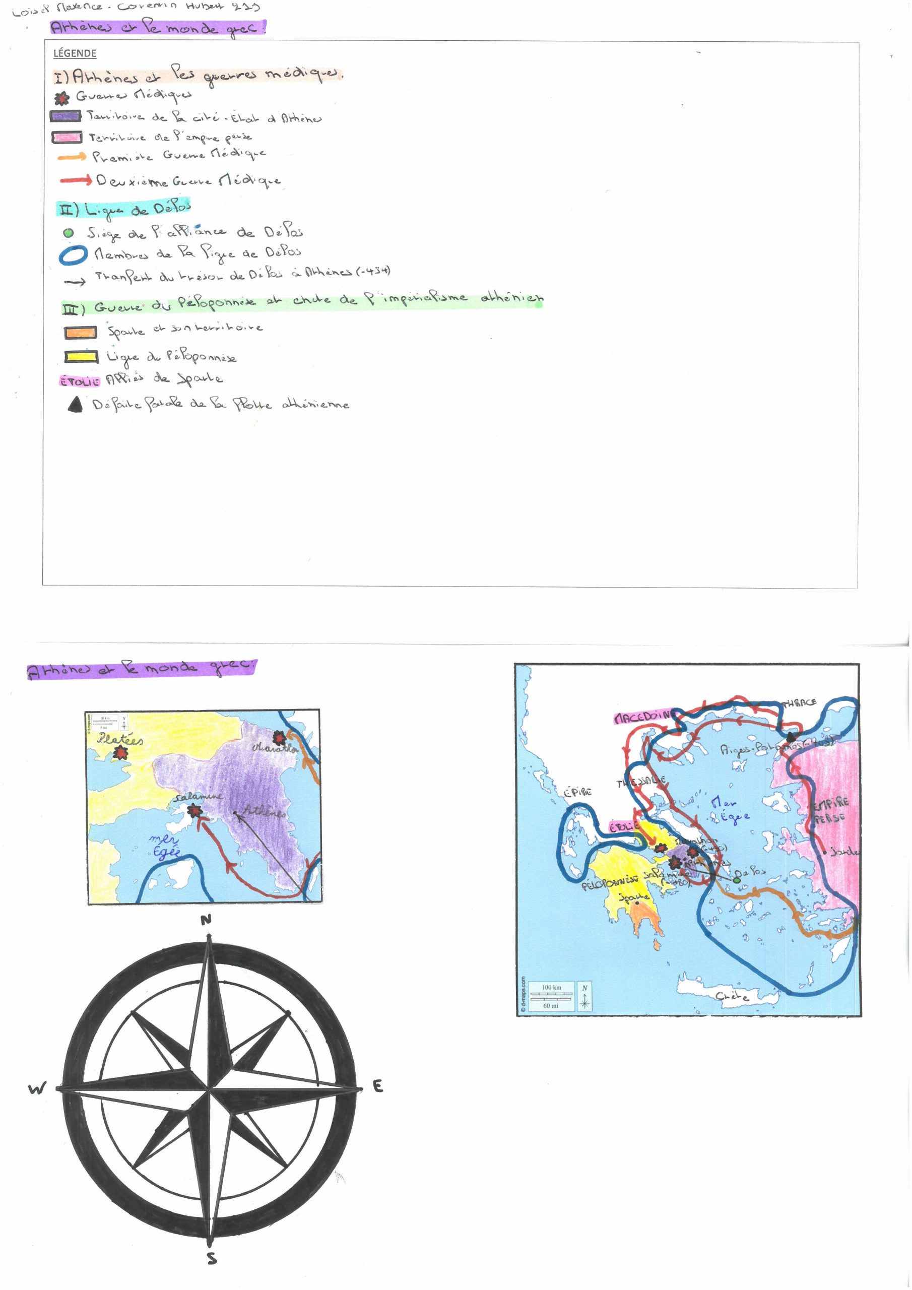 Cette carte est bien réalisée, mais vous devez penser à préparer l’espace avant de rendre la carte définitive, car l’espace est mal organisée. La rose des vents occupe beaucoup d’espace. Le légende est lisible, mais la carte un peu trop chargée. Par contre, je trouve la légende bien organisée, et avec des informations pertinentes, même si ça aurait été bien d’ajouter les dates des batailles. Le coloriage est un peu faible.