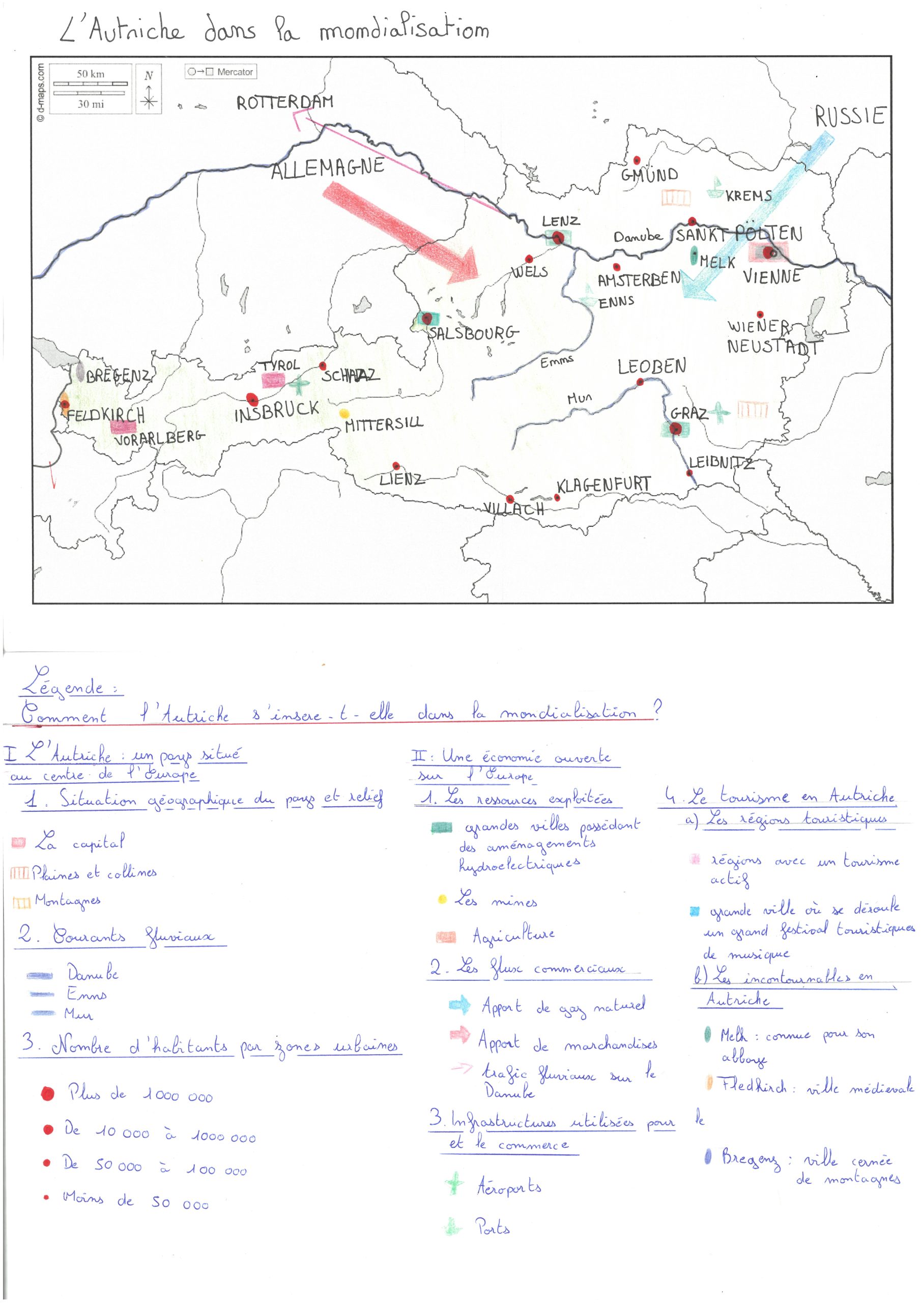 Comme je l’ ai dit au début de mon commentaire votre légende ne manque pas d’ informations, sur ça pas de doute possible . mais je me pose une question .Vous avez bien parlé de ce que le pays reçoit comme importation , de ce qu’il produit pas pas de ce qu’il exporte et vers qui . Je trouve cela un peu dommage car c’ est un peu un élément clé de la mondialisation . Maintenant vous n’ êtes pas hors sujet car, comme je l’ ai dit à l’instant, vous parler des principaux alliés économiques importateurs de l’ Autriche ainsi des principales sources économiques du territoire sur lequel vous travaillez . Aussi vous avez mis tous les noms des villes présentent sur votre carte mais était-ce bien nécessaire ? A mon avis non car certaines ont juste comme informations les concernant leur nombre d’ habitants . Je pense que vous auriez pu vous contenter juste de celle où il pouvait s’ y dérouler des importants évènements . Pour résumer : mettez plus de couleur , éviter le système de la taille des figurés pour les différencier et il est clair que votre point fors c’ est l’information . Bonne continuation
