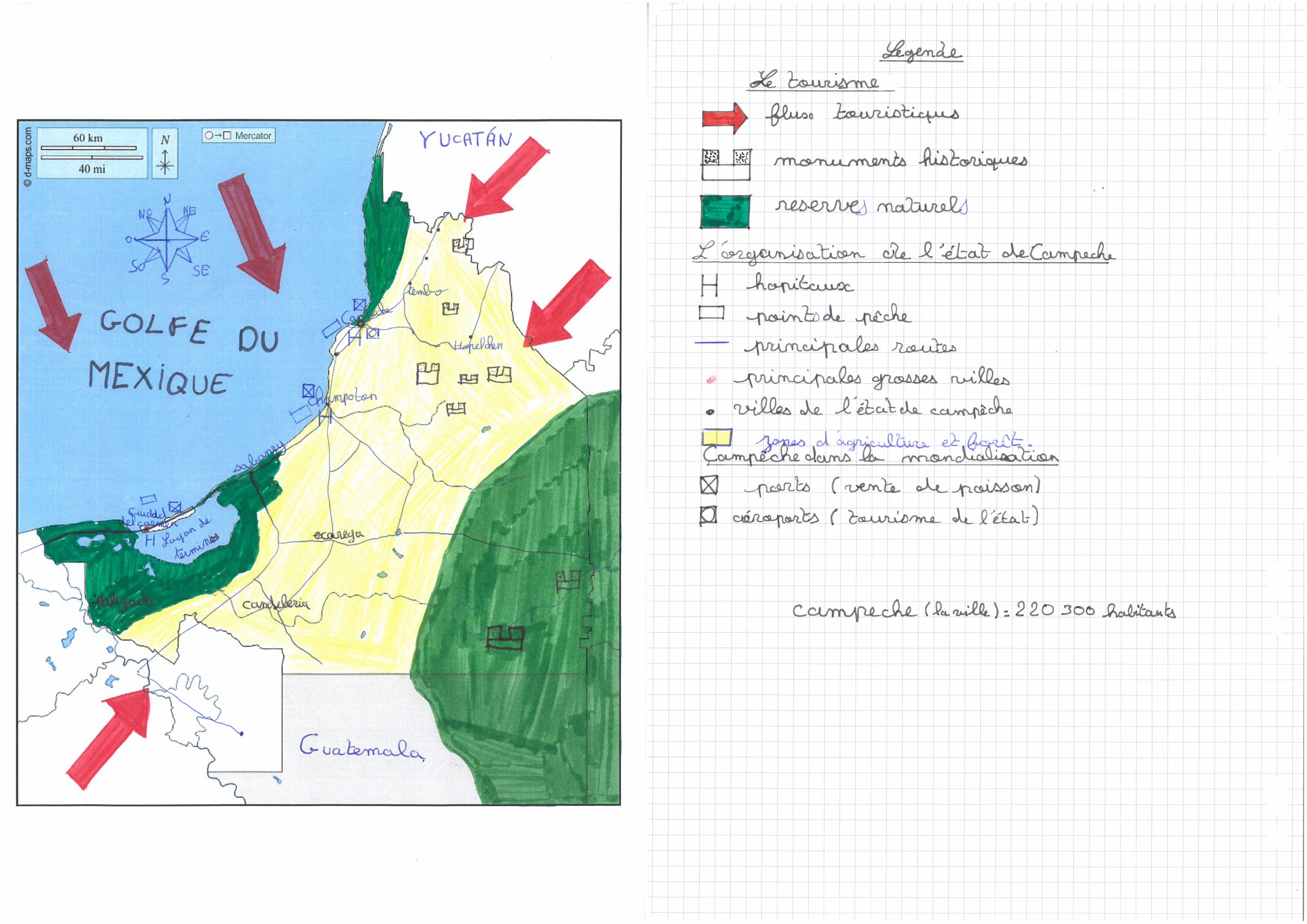 Vous aurez pu mettre « réserve naturel » dans l’organisation du territoire . Je ne retrouve pas les flux commerciaux sur la carte. La carte est n’est pas lisible dsl.Je n’ai pas retrouvé la capitale . Pour « principales grosses villes » le mot exact c’est « métropole ». Autre point tout ceux qui est terrestre c’est en noir et non en bleu donc Yucatan et le Guatemala aurait du être en bleu . La légende se fait sur une feuille blanche et non une feuille à carreaux.