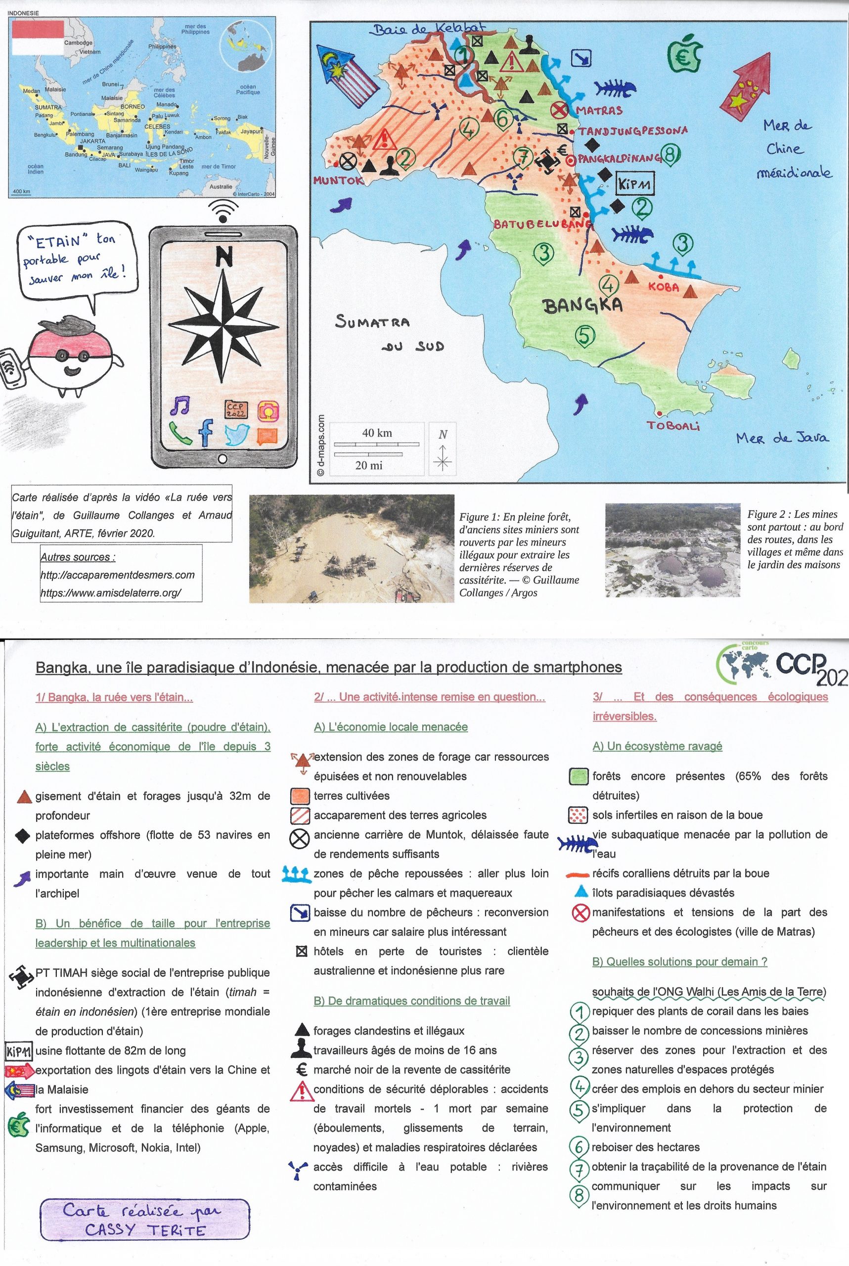 Déjà je trouve votre carte très très belle. Elle est colorée, lisible et agréable à observer. Votre légende est super organisée. Tous les figurés de votre légende sont sur votre carte même si cela a peut vous paraitre évident j’ ai vu d’ autre carte où ce n’ était pas le cas. Et de plus elle est très complète. Vous parler beaucoup de ‘ impacte que cette exploitation à sur l’ environnement et l’ écologie. Vous avez bien mis en avant que cette économie surpasse toues les autre sur cette île et que l’ étain est vraiment présent partout. Avec les commerces illégaux, l’ abandons de la pêche pour s’ orienter vers ce secteur, les mines dans les endroit les plus improbables… Mais je ne vais pas vous refaire l’inventaire de votre carte dans mon humble commentaire . Vous expliquez bien que c ‘est avec l’ étain que l’on fabrique les portables, tablettes, etc… Je trouve cela génial le jeux de mots que vous avez fait avec le mots étain/éteint. Qui, en plus d’ être drôle est engager. Vous avez rajouter des photos ce qui complète encore un peu plus votre carte. Et le territoire que vus cartographiez est relativement localisable dans le monde.