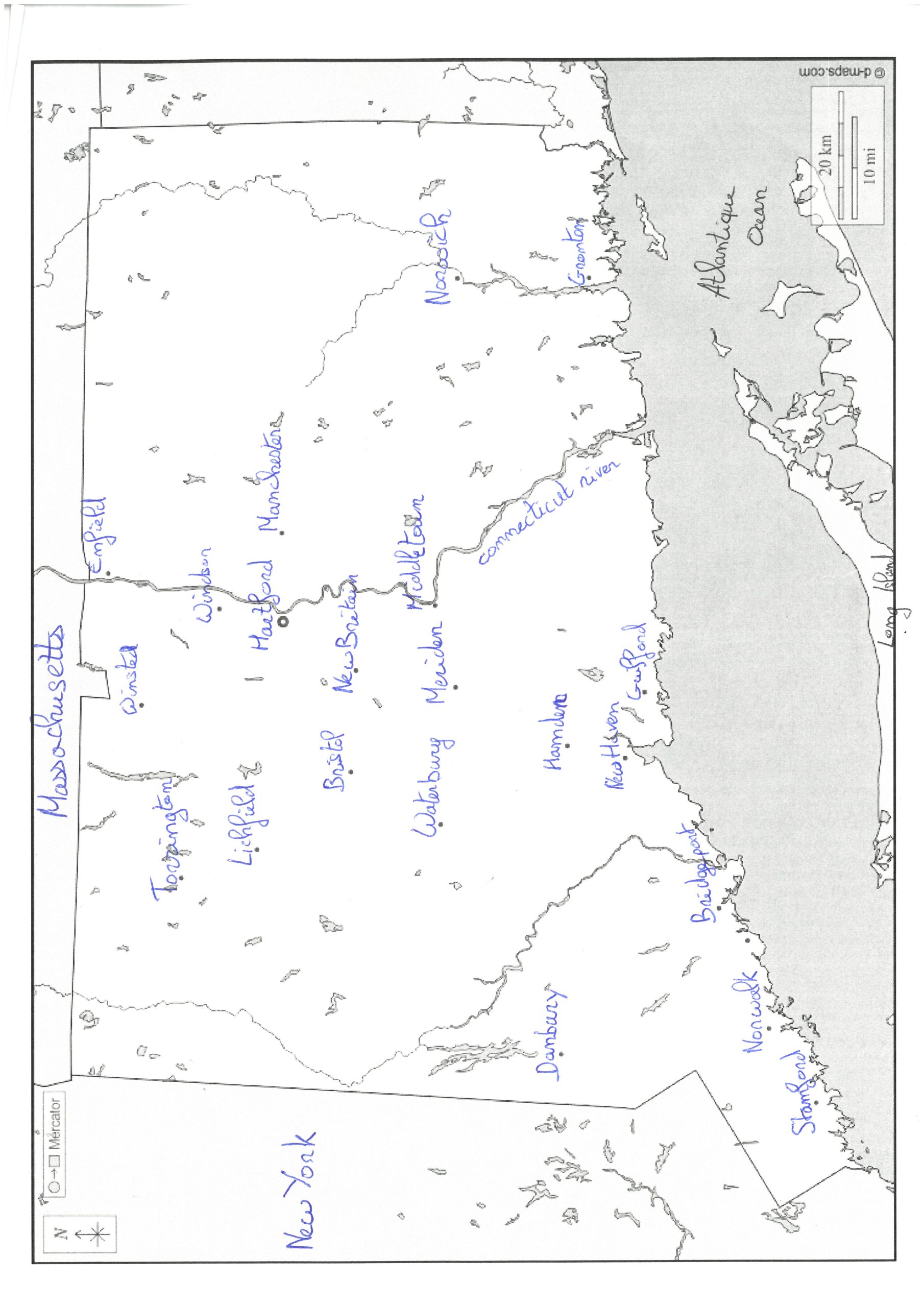 Je trouve personnellement que votre carte est propre,les noms des villes sont lisibles mais cependant il y aurait vraiment besoin d’une légende car on ne se retrouve pas sur votre carte je ne reconnais donc pas comment le Connecticut est-il relier au monde. J’ai aussi remarqué que vous n’avez pas respecter les couleurs je veux dire par là que les noms des océans,mers,fleuves etc… (éléments aquatiques) sont censés être écris en bleu et non en noir et les noms des pays,continents,villes etc (éléments terrestres) sont censés être écris en noir et non bleu. Il manque aussi les figurés de surface,linéaire et ponctuel. Je pense donc que vous auriez pu faire plus d’effort pour ce premier tour.