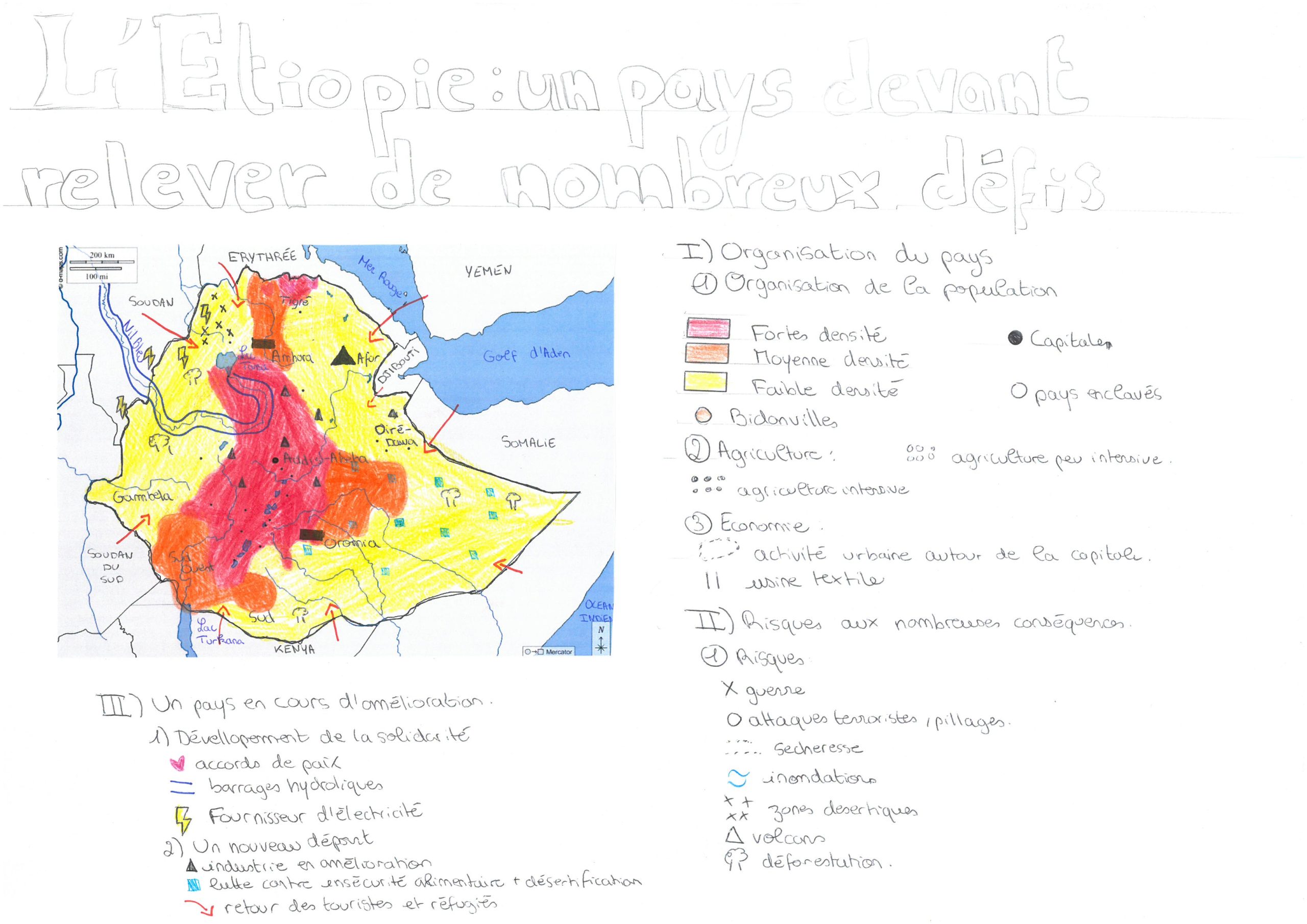 Cependant, il y a quelques points négatifs a noter, notamment sur le coloriages du fond qui aurait pu peut-être être plus propre ainsi que les légendes qui aurait peut-être pu être plus alignées. Certaines représentations cartographiques, tel que les usines de textiles par exemples, ou encore la couleur, part exemples de l’accord de paix , pas trop visibles sur la cartes, aurait peut-être être mieux choisis. Je penses que le titre dans une autre couleur ainsi qu’une rose des vent aurait été beaucoup plus cohérent . Beaucoup de vos légendes présentent sur le coté ne sont pas visibles sur la cartes comme les agricultures, la sécheresse, les volcan , les bidonvilles etc. .