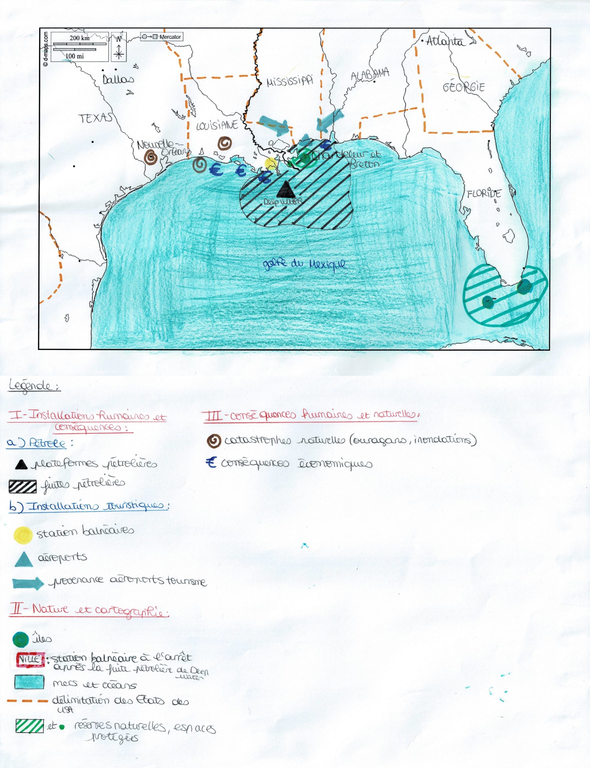 la carte n’est pas forcément propre dans l’ensemble, il y a trop de coups de crayons et les figurés sont brouillons, les prochaines fois utilisez un mouchoir afin de lisser le coloriage et de le rendre plus propre, par contre l’idée des hachures pour représenter la fuite pétrolière est une super idée !
