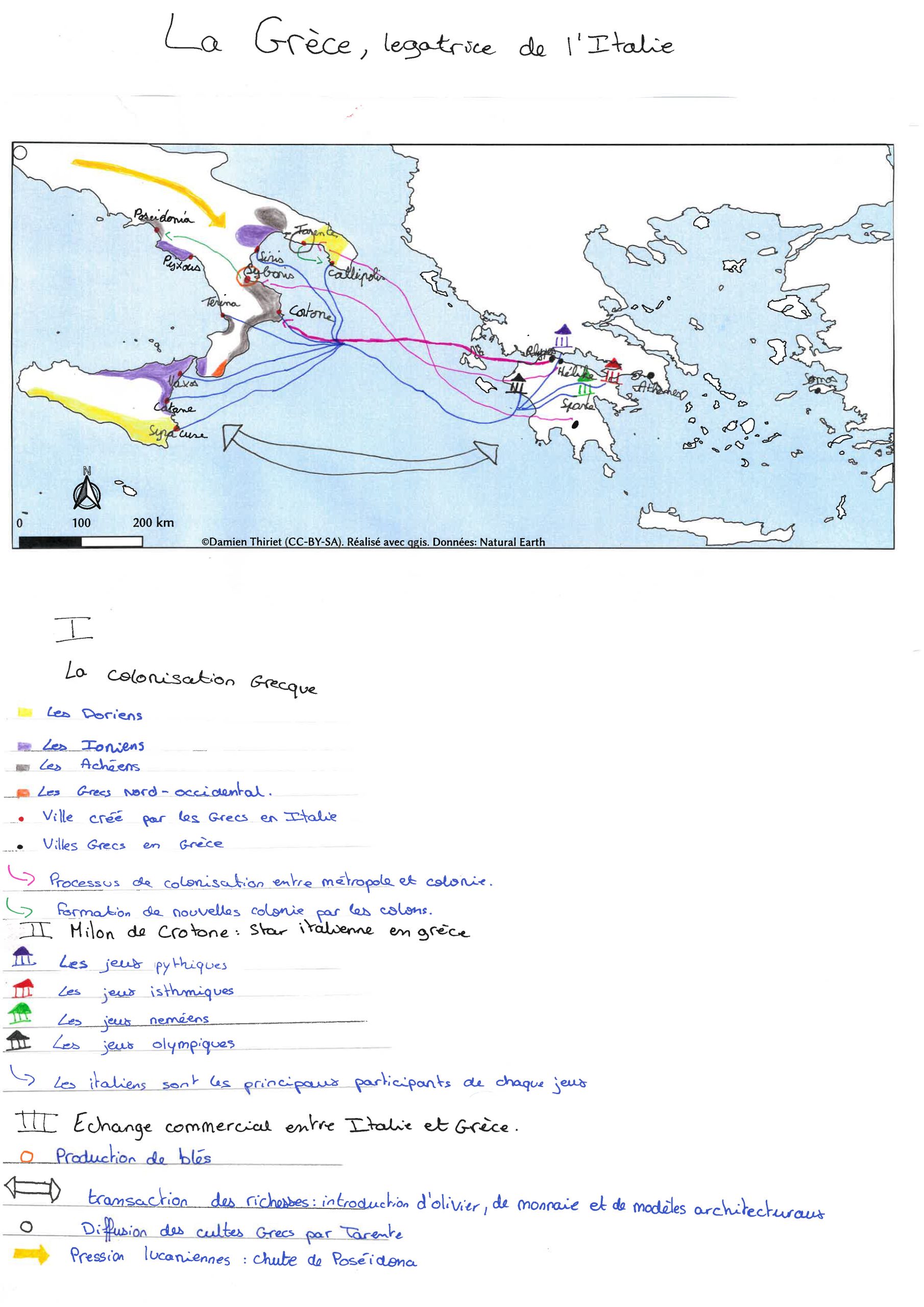 Pour les points négatifs, je trouve que les flèches reliant la Grèce à l’Italie ne sont pas assez soignées. La partie sur l’Italie manque d’informations comme par exemple le nom de certaine villes importantes comme Rhégion qui est un passage stratégique ou bien Pithécusses et Cumes qui sont des grandes interfaces commerciales. La flèche montrant la pression lucanienne n’est pas représentée correctement, elle doit descendre jusqu’à la pointe de la botte. En Grèce, les endroits où se passe les jeux ne sont pas très bien décrits, nous ne savons pas dans quelles villes elles se situent. Vous aurez pu faire aussi une rose des vents. Sinon le reste est correcte.