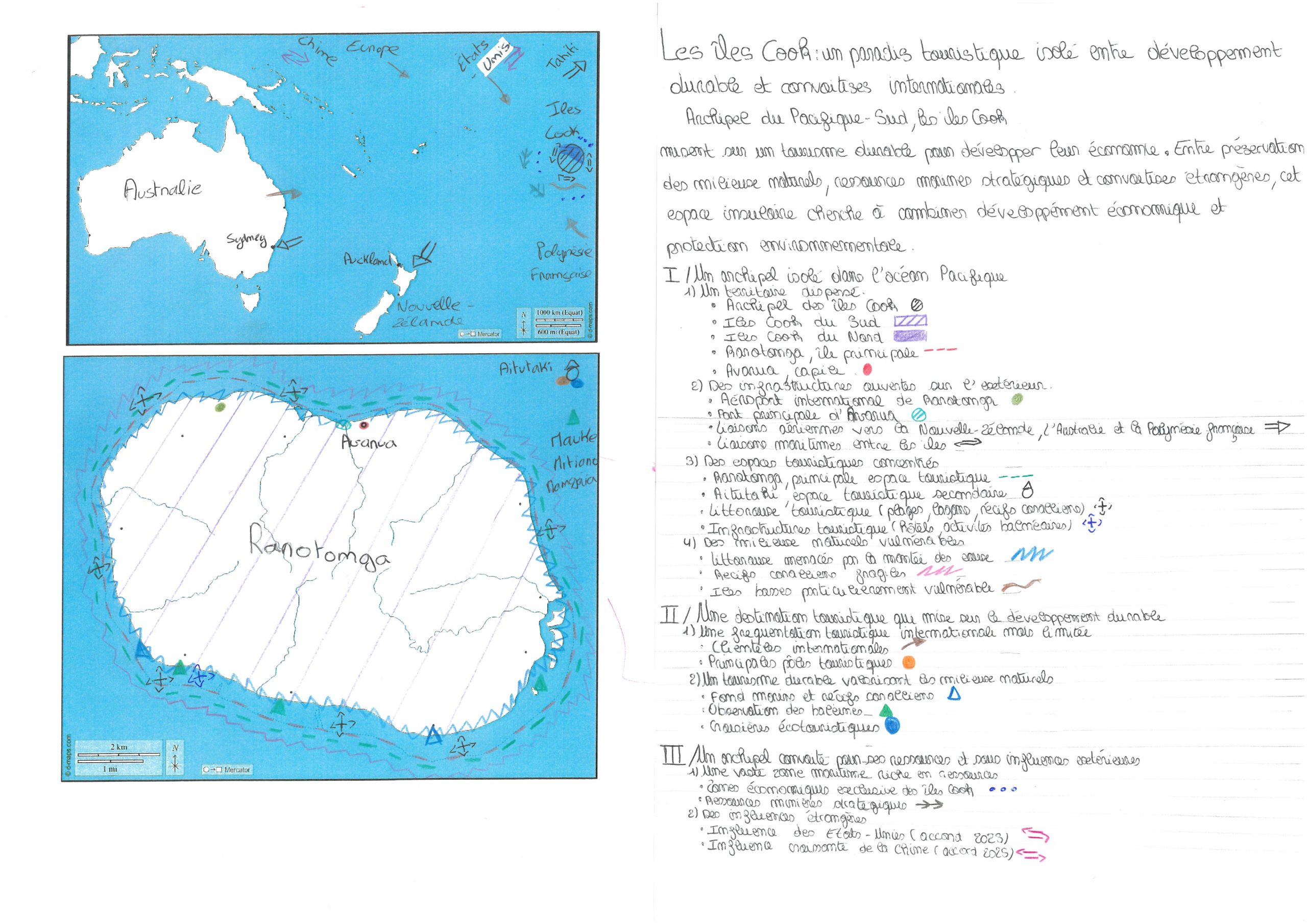 Salut ! Ta légende est complète et couvre bien tous les enjeux des Îles Cook, c’est du bon travail. Par contre, la carte est trop chargée, ce qui la rend difficile à lire par endroits. Pour améliorer ça, tu pourrais utiliser des figurés de surface au lieu de trop de lignes et, surtout, laisser plus d’espace entre les parties de ta légende pour avoir plus despace. C’est dommage parce que les infos sont intéressantes, mais ça manque juste d’un peu de clarté et de simplification. Bravo !