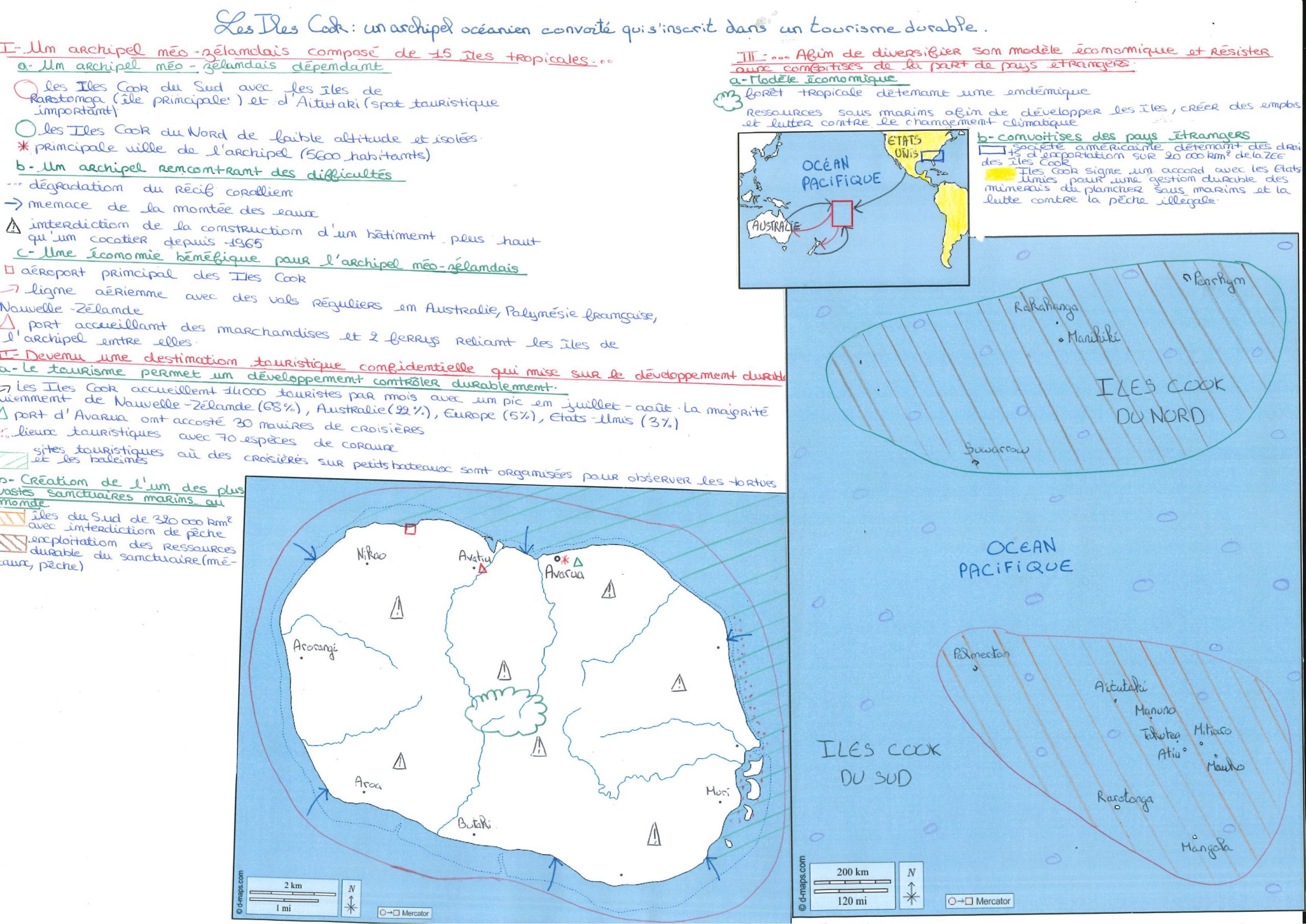 Ce travail est sérieux et bien construit. On voit que le sujet est compris et que les connaissances sont solides, avec des informations variées sur le tourisme, l’économie et les enjeux environnementaux. L’organisation est claire, les parties s’enchaînent logiquement et les titres permettent de bien suivre le raisonnement. La présentation est soignée, avec un effort visible dans l’écriture et l’utilisation des couleurs, ce qui rend l’ensemble agréable à lire. Les cartes sont également réussies : elles sont propres, lisibles et montrent une bonne maîtrise des localisations et des figurés.