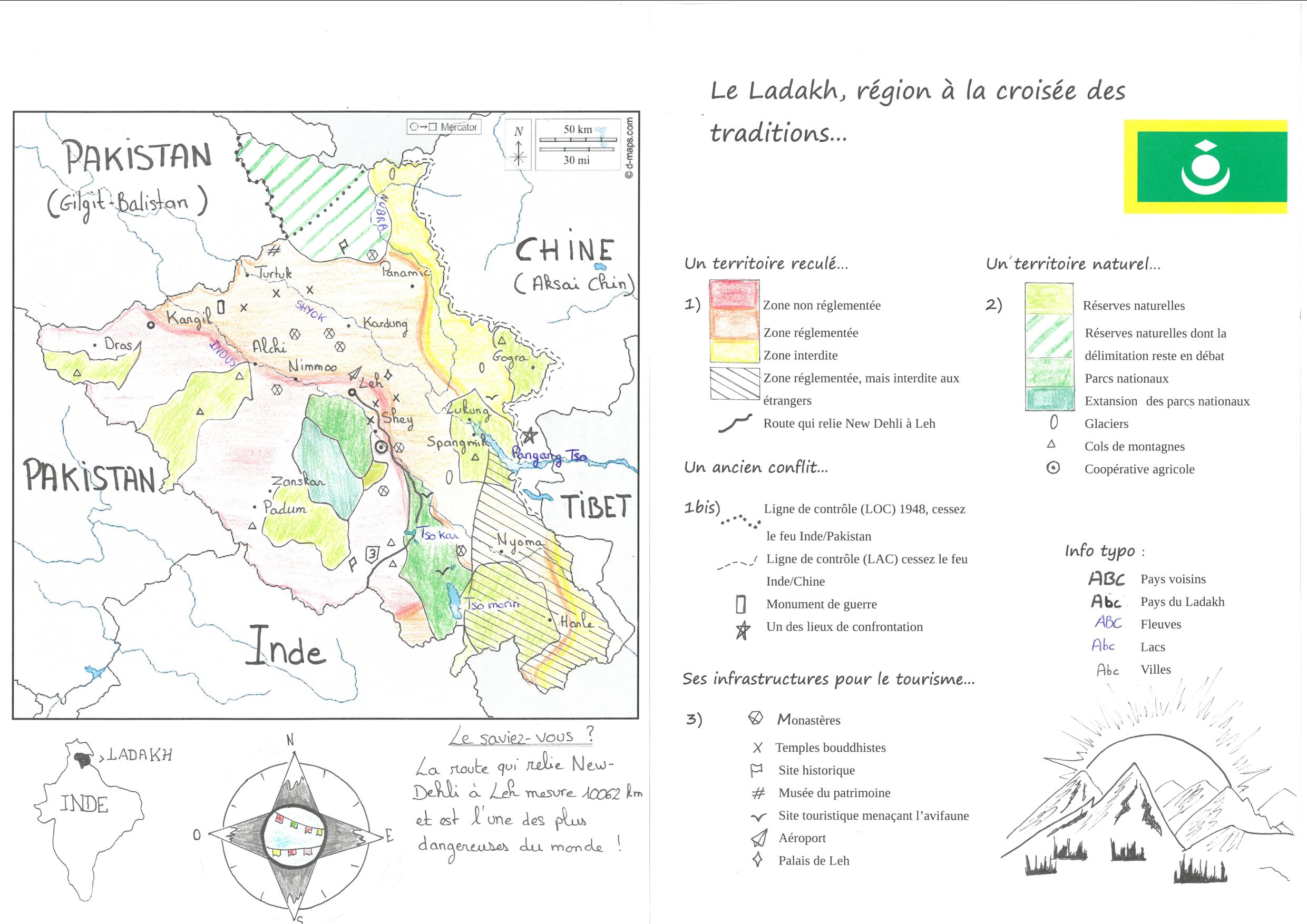 Bravo pour votre carte et votre parcours, je suis très contente de noter votre carte. Elle est très jolie, j’aime beaucoup votre rose des vents et le « le saviez-vous » ainsi que le fait d’avoir mis le drapeau du Ladakh et le dessin des montagnes. Cependant les couleurs de votre carte sont un peu pâles mais sa reste une très bonne carte.