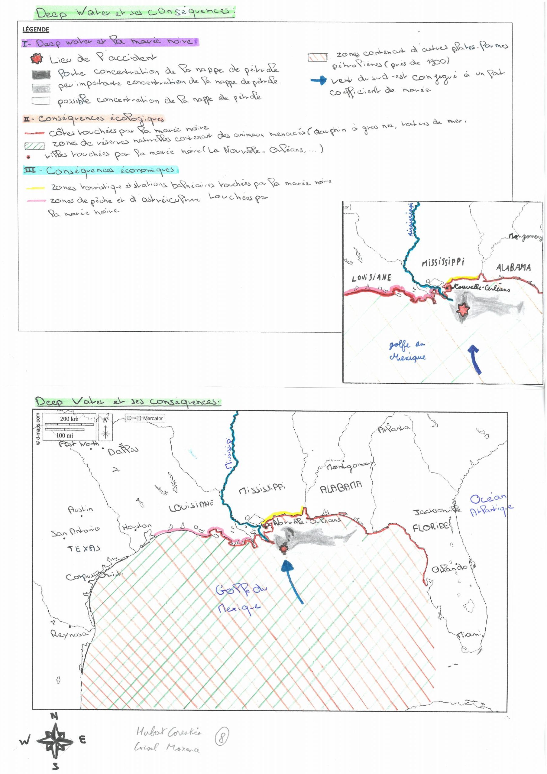 Dans la légende , les parties sont bien classés , les figurés utilisés sont très adéquats .Toutes les informations sont présent dans la carte, personellement je ne vois pas l’intérêt de mettre Nouvelle-Orléans entre paranthèse après villes touchés par la marée noire si c’est pour nous facilité à trouver la ville en question je pense que vous auriez dû changer la couleur du point . Vous auriez aussi pu préciser dans la légende de comment vous avez représenté les Etats , les villes et le fleuve sous une grande partie repères géographiques et vous auriez peut être pu ajouter un peu plus d’informtion sur les conséquences économiques ( surtout à propos du tourisme ). La forme du marée est très précis et l’idée de mettre plusieurs profondeur au niveau des couleurs pour indiquer la concentration du pétrole est géniale , mais je ne sais pas si c’est à cause du scan ou autre , je n’arrive pas à distinguer la couleur de la possibilité de la concentration du pétrole dans la carte ni sur la légende .