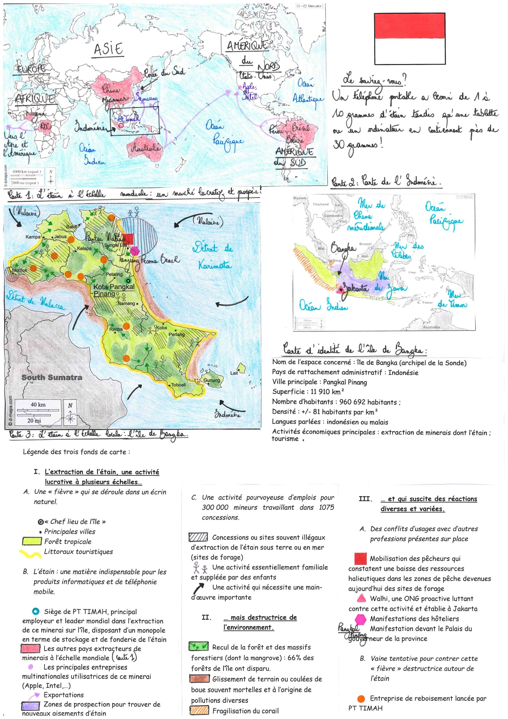Votre carte est très belle avec de belle couleur est une très belle légende. Votre carte est votre légende sont assez complète , vous avez mis quand même beaucoup d’informations ce que je trouve très bien. Vous avez écrit certaines choses à la main et je trouve que ça rajoute quelque chose a votre carte surtout que vous avez une très belle écriture. Par contre ce que je trouve dommage c’est que vous n’avez pas fait de rose des vents et je pense que si vous en auriez fait une ça aurait rajouter encore quelque chose a votre carte mais ce n’est pas grave. Mais par contre vous n’avez pas fait de rose des vents mais vous avez dessiner le drapeau de l’île de Bangka ce qui est très bien je trouve même que le drapeau fait à la main est mieux que un drapeau imprimé. Je trouve ça superbe d’avoir mis 2 cartes du monde pour que nous comprenons où se trouve plus exactement l’île de Bangka.