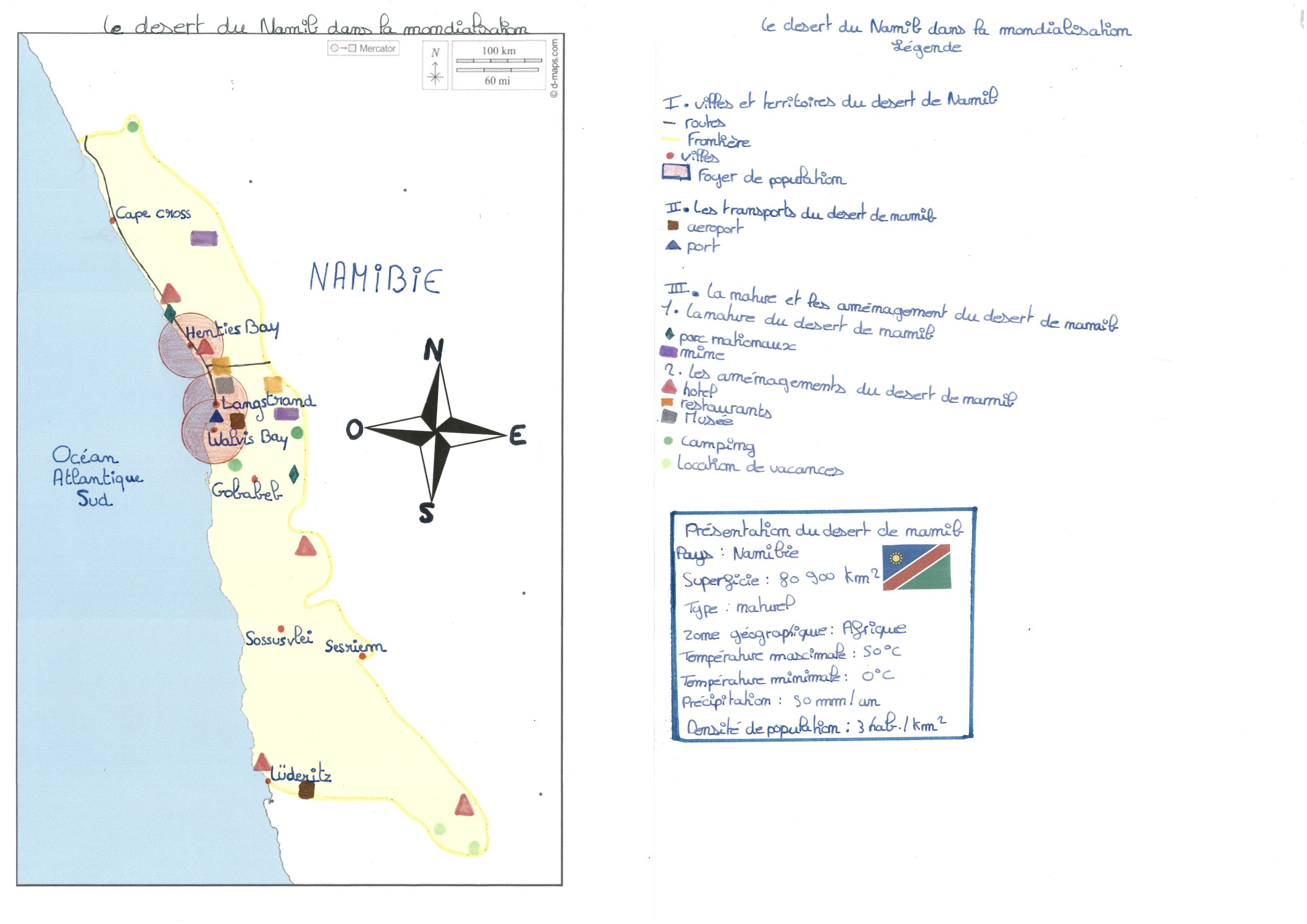 Votre légende est claire et lisible. Vous avez su trouver des informations pertinentes et la petite présentation sur le désert de Namib est une bonne idée. Elle nous permet de nous rendre compte de sa superficie , de sa densité de population. On constate grâce à vos recherches que malgré une petite superficie les aménagements sont nombreux.