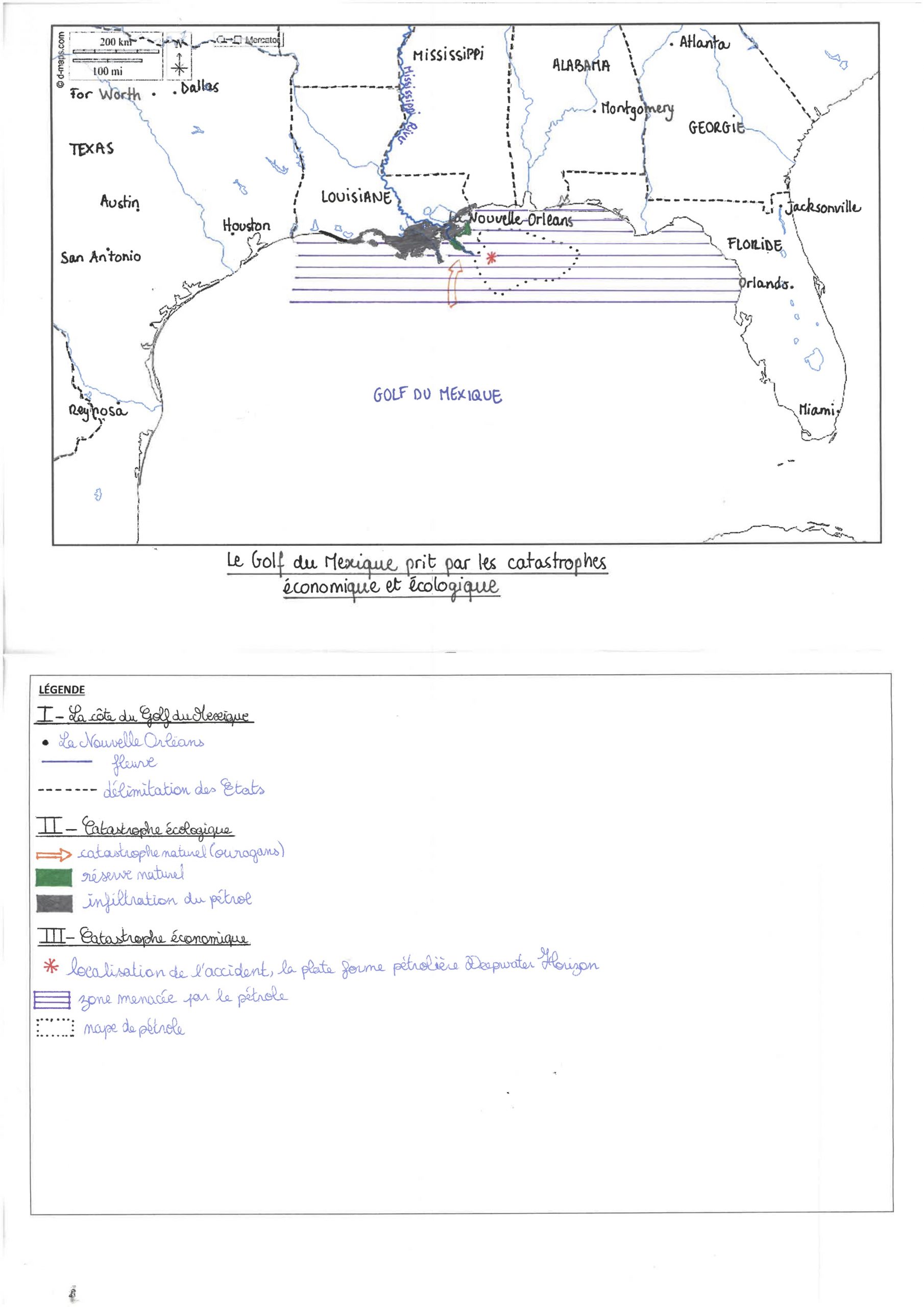 J’aime beaucoup votre carte, la légende est y est claire et simple à lire, on voit tout de suite qu’on devrait dire si on avait à faire un développement construit dessus. Les figurés sont très facile à comprendre, à repérer et assez logiques. Vous avez pensé à delimiter les états se qui rend aussi la compréhension plus facile. Les villes importantes sont aussi écrites, ce qui est pratique. Pourtant, j’ai l’impression que vous avez colorié aux feutres, se qui est deconseillé… De plus, je me demande si il n’aurait pas été mieux d’inverser la legende » nappe de pétrole » et « infiltraton du pétrole » car pour moi, la nappe de pétrole est plus « importante » que l’infiltration du pétrole. Mais sincèrement je trouve que votre carte est vraiment très réussie, bravo !