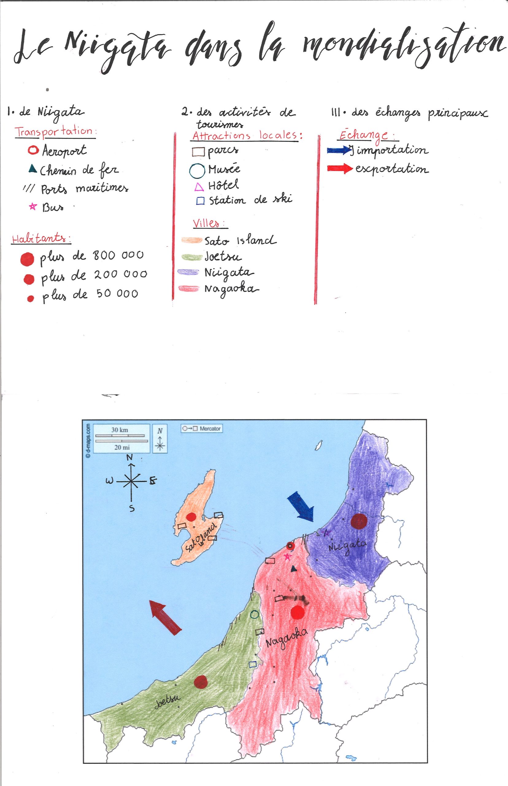 Je trouve que les figurés pour les chemins de fer sont mal choisis (parce que des chemins de fer sont des routes, donc ça ne peut pas juste se trouver à un seul endroit, contrairement à une gare) et que ceux de parc et station de ski se ressemblent trop sur la carte. Les points qui représentent les habitants sont presque de la même taille et la plupart des figurés ne sont pas assez visibles sur la carte. Les flèches des échanges ne sont pas très précises (on ne sait pas vraiment d’où ça part et où ça arrive). Dommage que les préfectures (qui ne sont pas les villes) soient notées dans les activités de tourismes. Le mot transportation n’a pas la même définition que transport et le coloriage pourrait être un peu mieux soigné.