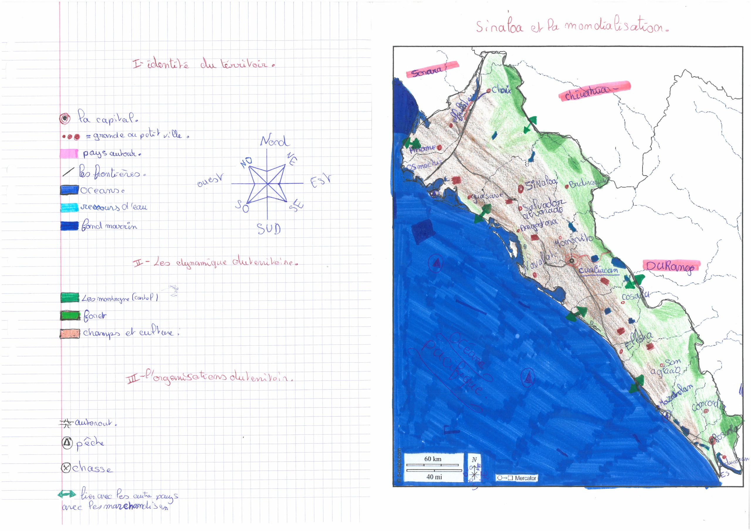 Les premières choses que je remarques sur votre carte est la mer repassée au feutre ! Je sais que beaucoup avant vous l’on signaler mais je tenais aussi à le dire 😄. C’est dommage de coloriage aurait pu être mieux fait 🌈🌚, plus soigné peut être ? Vous n’avez pas besoin de mètre au fluo les noms de pays environnent, pareil dans la légende, cela ne sert à rien de le préciser car ça n’a rien à voir avec le Sinaloa 🌍 ! Je trouve cela dommage qu’il n’y ai pas de questionnement, les titres de la légendes auraient pu y répondre ✌🏻.