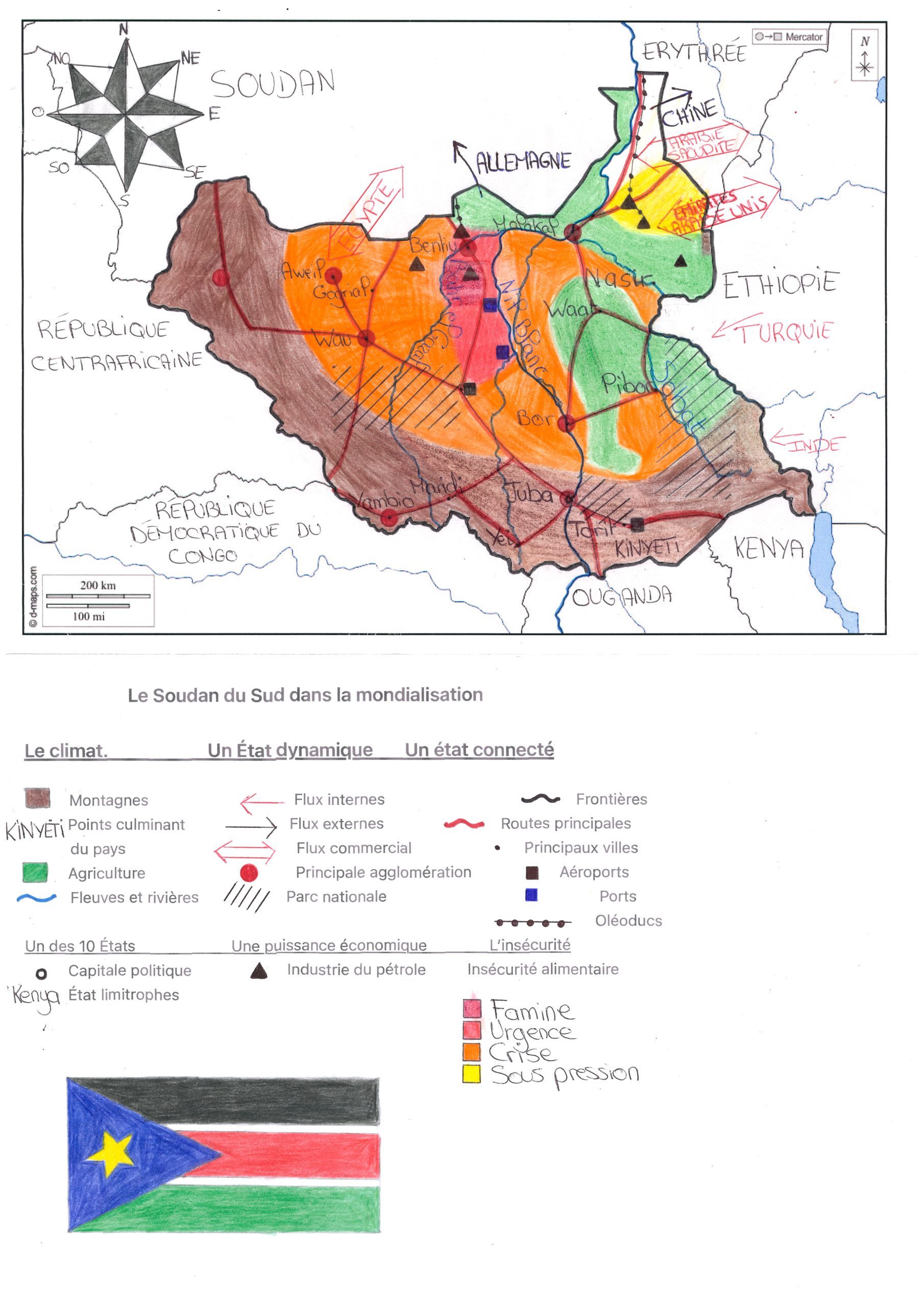 je trouve que votre carte est bien organisé mais qu’elle est un peu mal colorié. C’est une bonne idée de l’avoir colorié en fonction de la famine, etc… Sinon le drapeaux du Sud-soudan est très bien fait. La légende est bien présenté mais il manque peut-être les flux migratoires et les sous tires n’apporte pas plus d’informations que ça et c’est dommage. Très bonne continuation.