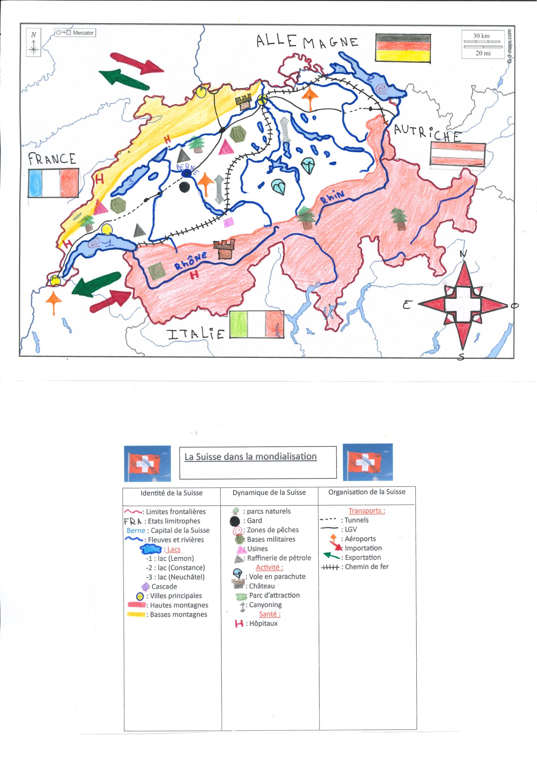 Concernant votre légende est bien , il y a les trois parties demandées mais je pense que vous auriez pu remplir un peu plus votre légende avec les dynamiques de la suisse et l’identité du territoire mais la carte en elle même est très bien faite.