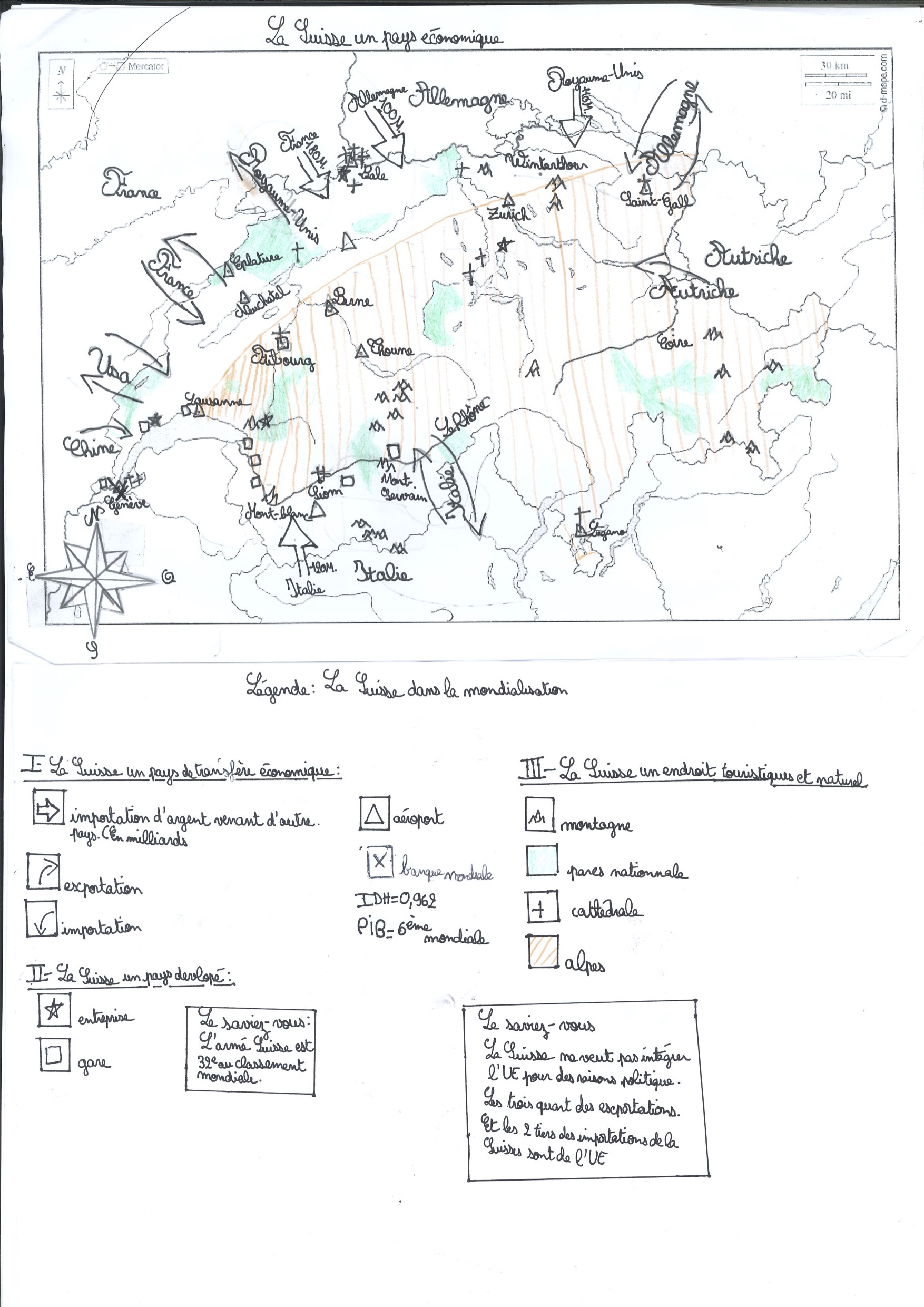 Néanmoins je trouve que votre carte manque de couleurs, vous auriez pu potentiellement taper la légende sur ordinateur et trouver un peu plus d’informations (je ne dis vraiment pas que c’est facile d’en trouver (exemple: que sa position géographique privilégie en fait un véritable carrefour économique et culturel au sein de la mondialisation malgré le fait qu’elle soit enclavée) ) et ensuite vous auriez aussi peut-être pu délimiter les frontières de la Suisse car ça se mélange un petit peu avec les autres pays. Mais votre carte reste très belle ! Les « le saviez vous ? » sont une très bonne idée, les titres d’organisations de la légende sont très bien trouvés et le titre en lui même aussi est bien trouvé. Bravo pour cette carte !!!